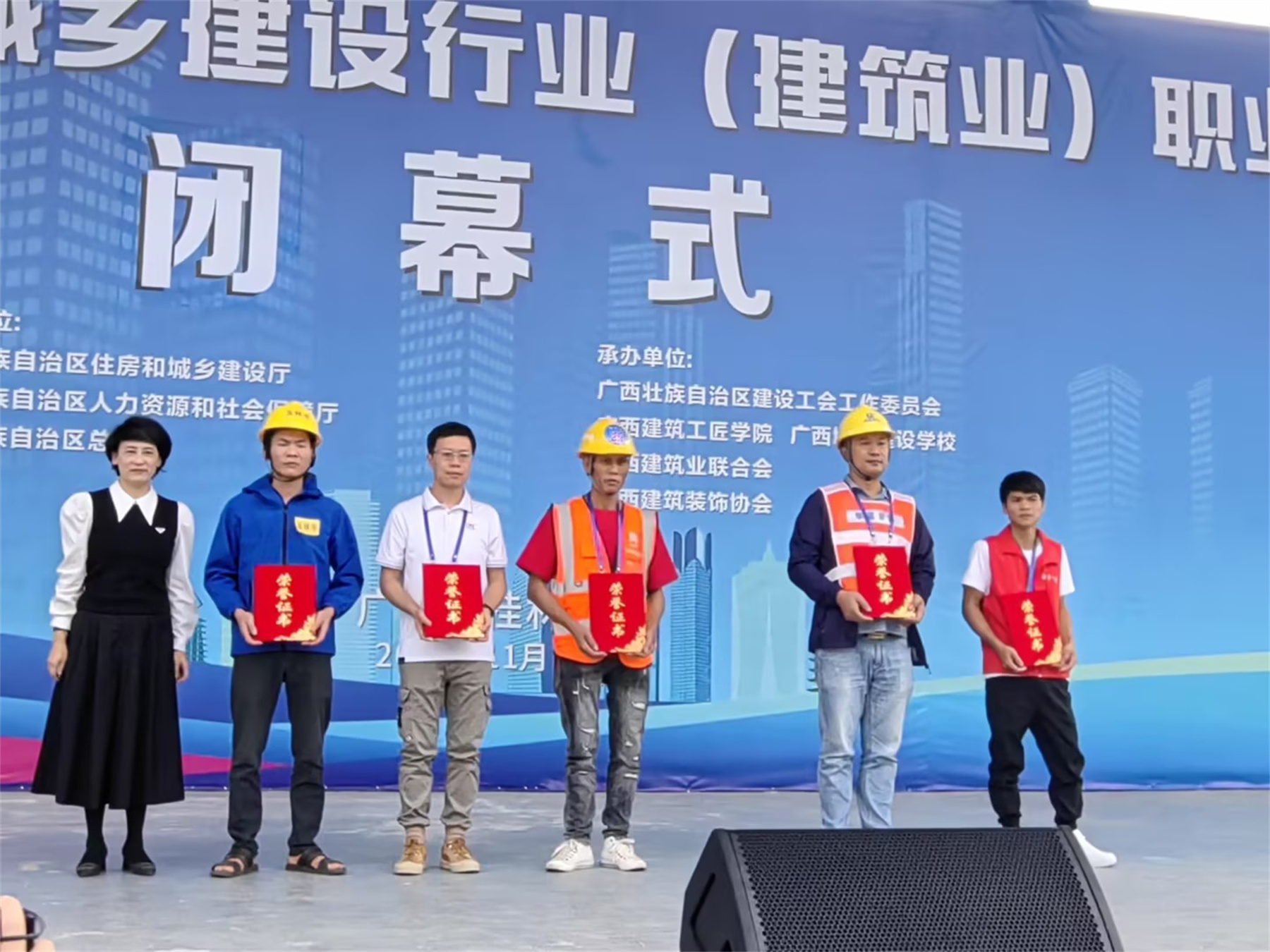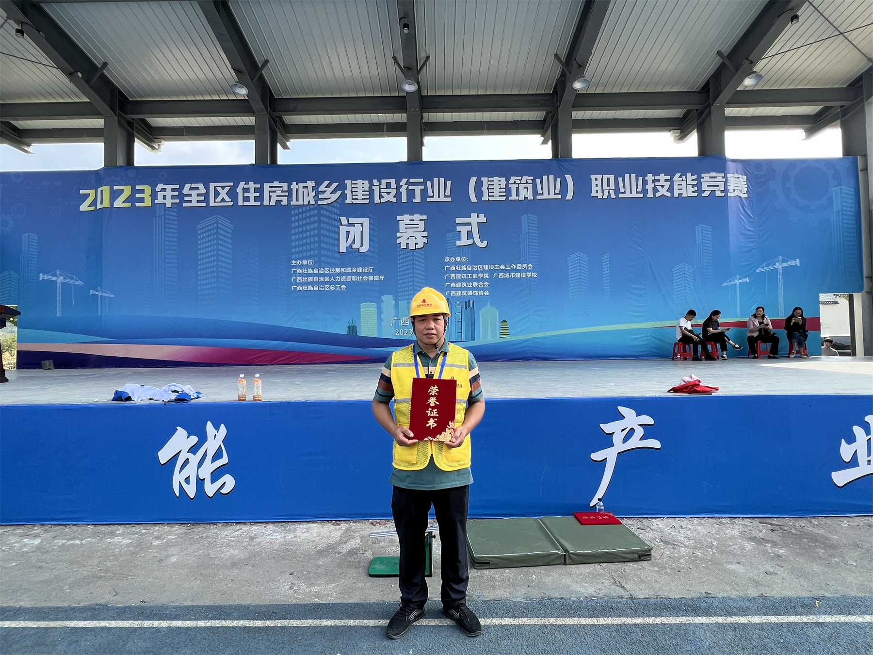 本次职业技能竞赛由广西壮族自治区住房和城乡建设厅,广西壮族自治区人力资源和社会保障厅,广西壮族自治区总工会主办,建筑业承办单位为广西壮族自治区建设工会工作委员会,广西城市建设学校,广西建筑业联合会,广西建筑装饰协会联合承办。本次建筑业竞赛共设5个比赛项目,分别是抹灰工、砌筑工、钢筋工、精细木工、室内装饰设计(镶贴工)。